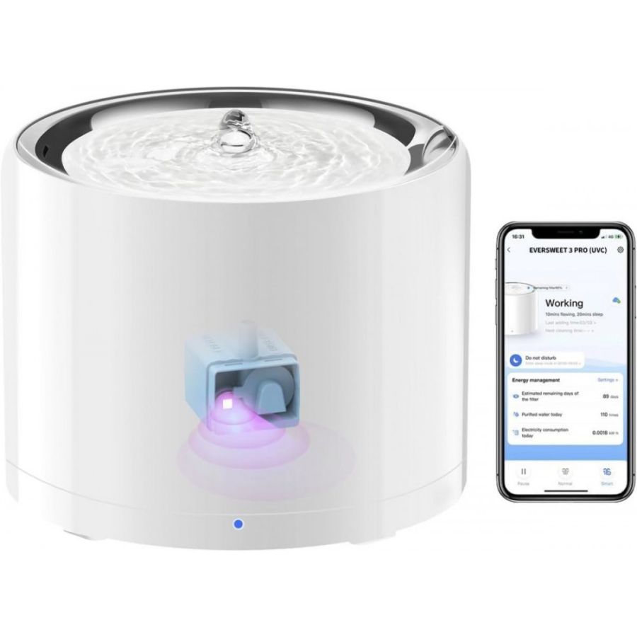 O PetKit Eversweet 3 Pro é uma fonte de água sem fios para cães e gatos, equipada com uma bomba silenciosa que mantém a água em constante movimento, criando uma experiência de bebida natural que incentiva os animais a beberem mais. A bomba está equipada com emissão de luz ultravioleta, que esteriliza a água, eliminando até 99,96% dos vírus e bactérias para manter o seu animal saudável. O ruído gerado é de apenas 35dB. O dispositivo é alimentado por indução magnética, eliminando a necessidade de carregamento. Possui três modos: inteligente, normal e noturno, cada um com diferenças no funcionamento da bomba e do esterilizador, que podem ser ajustadas na aplicação PETKIT. Os utilizadores também podem monitorizar o nível de água e o estado do filtro através da aplicação. A bomba para automaticamente quando o nível de água está demasiado baixo. Dentro do dispositivo, existem três tipos de filtros que purificam a água de pelos, pó, metais pesados e odores desagradáveis. O PetKit Eversweet 3 Pro é um dispositivo modular que pode ser facilmente desmontado em partes mais pequenas e limpo quando necessário.